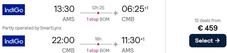 Fliegen Sie mit der indischen Billigfluggesellschaft IndiGo sehr preiswert von Amsterdam nach Colombo. Verfügbarkeiten gibt es von Februar bis März 2026 und die Preise starten schon bei 459 Euro.
