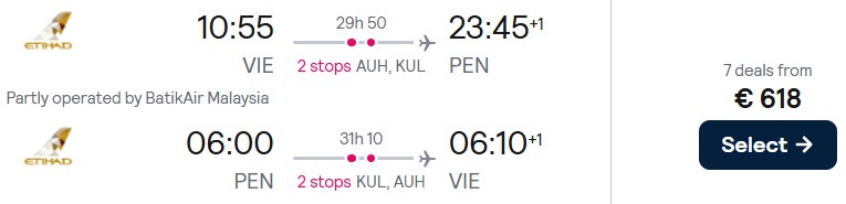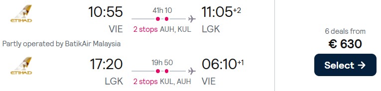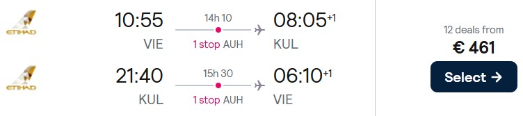 Etihad Airways bietet günstige Economy Class Flüge ab Wien nach Kuala Lumpur, Penang oder Langkawi in Malaysia an. Flüge sind von November 2025 bis März 2026 möglich und die Preise starten schon bei 461 Euro.