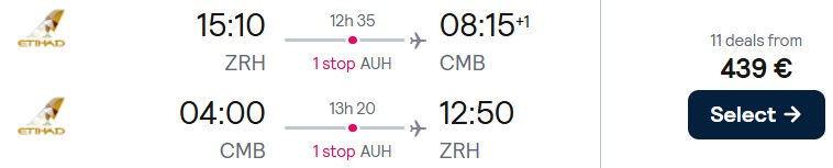 Etihad Airways bringt Sie ab Zürich günstig nach Colombo. Die Preise starten schon ab 439 Euro bei Abflug von November bis Dezember 2025.