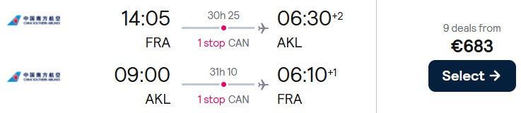 Fliegen Sie mit China Southern Airlines in der Economy Class preiswert von Frankfurt nach Auckland. Verfügbar ist das Angebot für Reisen im Mai 2026 und die Preise starten schon bei 683 Euro.