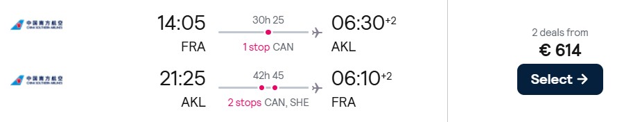 Fliegen Sie mit China Southern Airlines in der Economy Class sehr preiswert von Frankfurt nach Auckland. Verfügbarkeiten gibt es im Mai und Juni 2026. Das genannte Preisbeispiel haben wir vom 02. Juni bis 16. Juni 2026 gefunden.