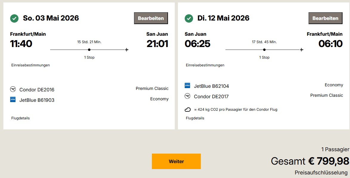 Bei Condor lassen sich im Moment sehr günstige Premium Economy Class Flüge von Frankfurt über New York nach San Juan / Puerto Rico buchen. Verfügbarkeiten gibt es ohne veröffentlichte Beschränkungen bei Abflug im Mai 2026.