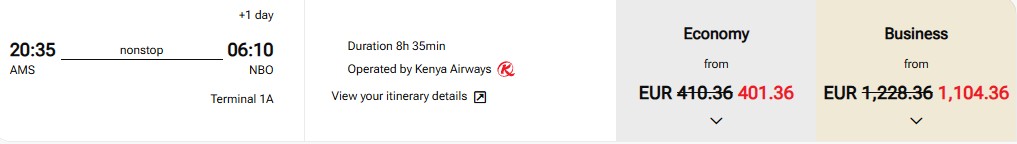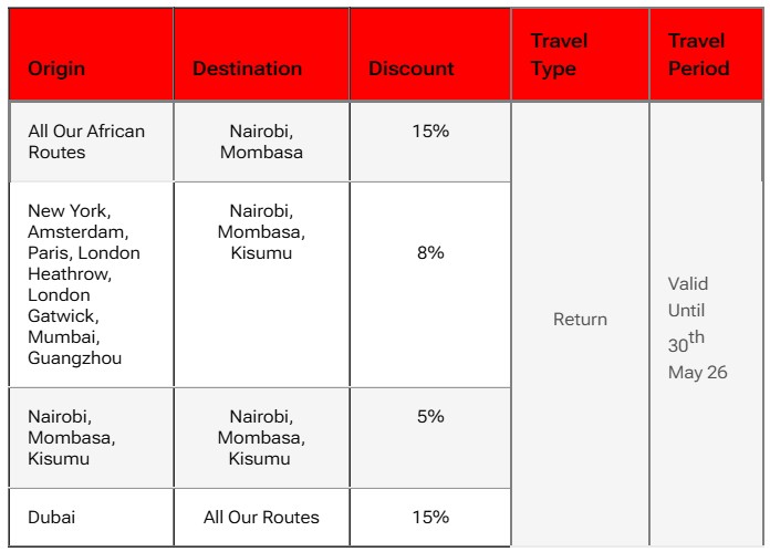 Auf ausgewählten Kenya Airways Strecken erhalten Sie mit dem Gutscheincode EID26 einen Rabatt von bis zu 15 %. Rabatt. Diese Aktion läuft bis zum 30. März und gilt für Flüge bis zum 30. Mai 2026 in der Economy Class und in der Business Class.