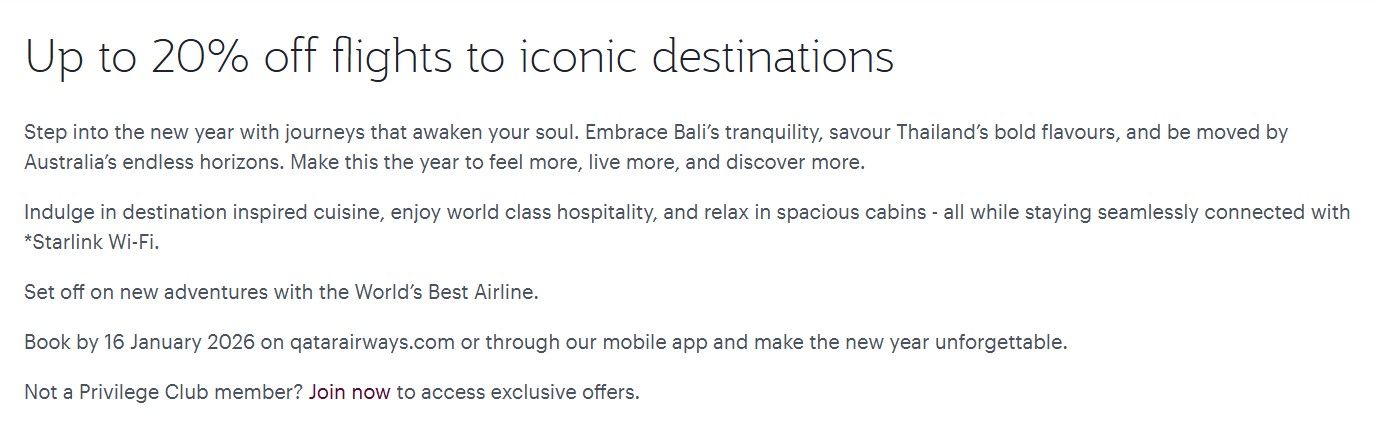 Erhalten Sie auf Qatar Airways Buchungen ab Europa zu vielen Zielen weltweit in der Economy Class und in der Business Class einen Rabatt von bis zu 20 %. Dies gilt für Buchungen bis zum 16. Januar für Flüge zwischen dem 10. Januar und dem 10. Dezember 2026.
