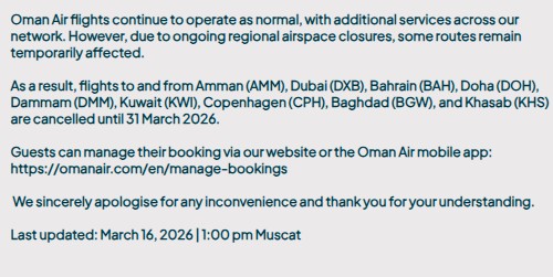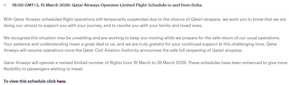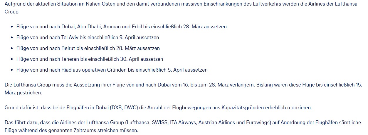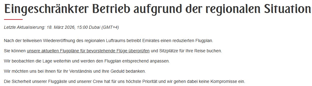 Der reguläre Flugbetrieb ist bei Emirates, Etihad Airways und Qatar Airways sowie auch Gulf Air und Kuwait Airways derzeit eingestellt. Teilweise bieten Airlines bereits eingeschränkte Flugpläne an.