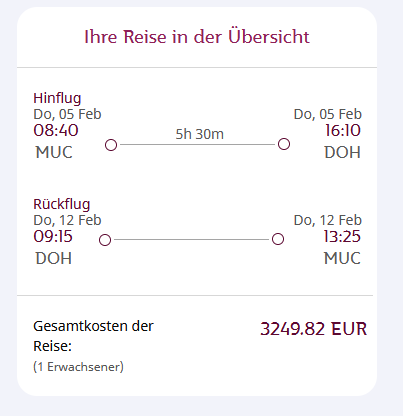 Die 250 GHA Discovery Dollars sind quasi ca. 200 EUR in Cash, der Priority Pass kann auch noch einmal mit 100 EUR eingerechnet werden. D.h. am Ende zahlt man effektiv ca. 1.075 EUR plus Steuern und Gebühren für einen Qatar Airways Business Class Return Flug nach Doha im Wert von 3.250 EUR. Hier ansehen und bestellen
