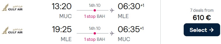 Mit Gulf Air fliegen Sie von Frankfurt oder München preiswert auf die Malediven. Verfügbarkeiten gibt es von September bis November 2025 und die Preise starten bei 584 Euro.