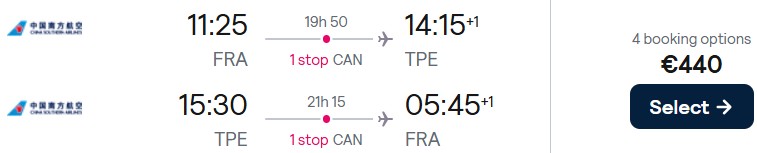 Bei China Southern Airlines lassen sich im Moment günstige Economy Class Flüge von Frankfurt nach Taipeh buchen. Verfügbarkeiten gibt es im Januar und Februar 2026. Die Preise starten schon bei 440 Euro.