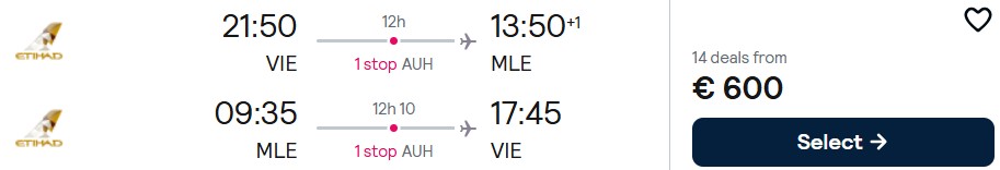 Fliegen Sie mit Etihad Airways in der Economy Class von Wien auf die Malediven ab 600 Euro. Verfügbarkeiten gibt es im Juni sowie von September 2026 bis Februar 2027.
