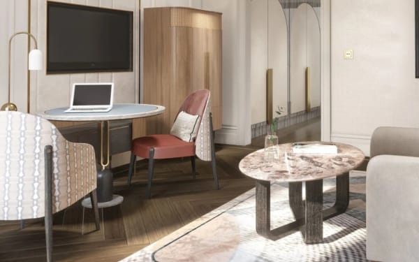 Hervorzuheben ist auch die Mandarin-Suite mit ihrer eleganten Vertäfelung, dem Layout in Form eines halben Sechsecks und dem Kopfteil, welches von den Steinmetz-Arbeiten des Gebäudes inspiriert eine Hommage an den Architekten Alfred Keller darstellt.