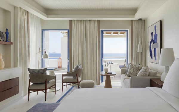Das Four Seasons Resort Mykonos eröffnet Mitte 2026 in der malerischen Kalo Livadi Bay. Es erhebt sich stolz auf unberührten Klippen und bietet auf einem über sechs Hektar großen Gelände eine Mischung aus weiß getünchten Gebäuden, verwinkelten Gassen und typisch kykladischem Flair. Entworfen wurde das neue Luxushotel vom renommierten Architekten Nicos Valsamakis und innenarchitektonisch veredelt von Wimberly Interiors. Die Anlage umfasst 94 Zimmer, Suiten und Villen – mehr als 30 davon mit privaten Plunge-Pools und weitem Blick auf das glitzernde Meer.
