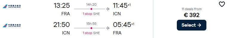 Mit China Southern Airlines fliegen Sie im Moment schon ab 392 Euro in der Economy Class von Frankfurt nach Seoul. Der Sale läuft bis Ende Dezember und Verfügbarkeiten gibt es bei Abflug zwischen Mitte Januar und Ende Januar 2026 und es gelten als Einschränkungen ein Mindestaufenthalt von 6 Tagen oder einer Nacht auf Sonntag und ein Maximalaufenthalt von 90 Tagen. Diese Flüge buchen in der Buchungsklasse T ein und der genannte Preis wurde vom 22. Januar bis zum 28. Januar 2026 gefunden.