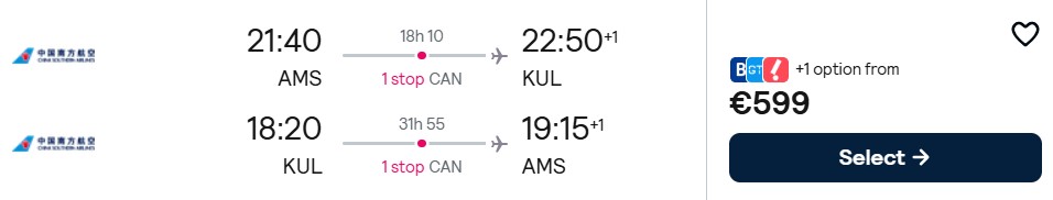 Fliegen Sie mit China Southern in der Economy Class von Amsterdam nach Kuala Lumpur ab 599 Euro. Verfügbar ist das Angebot für Abflüge zwischen Oktober und Mitte Dezember 2026.