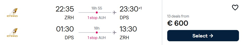 Fliegen Sie mit Etihad Airways ab 600 Euro von Zürich nach Denpasar. Verfügbarkeiten gibt es im Juni sowie von September bis Dezember 2026.