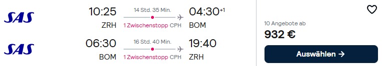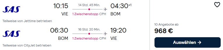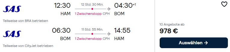 SAS Scandinavian Airlines verkauft bis auf Widerruf relativ günstige Premium Economy Class Flüge von D-A-CH nach Mumbai. Verfügbarkeiten gibt es ab Anfang Juni 2026 und es gelten als tarifliche Einschränkungen ein Mindestaufenthalt von 6 Tagen oder einer Nacht auf Sonntag. Die Airline bucht Sie in der Buchungsklasse A ein und genannte Preise wurden bei Probebuchungen im Oktober 2026 gefunden.