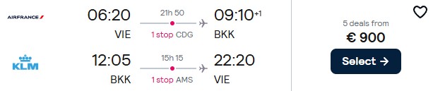 Air France und KLM verkaufen bis auf Weiteres günstige Premium Economy Class Flüge von Wien zu verschiedenen Zielen in Thailand. Verfügbarkeiten gibt es mit Unterbrechungen bei Abflug bis September 2026. Die im Text genannten Preise wurden bei Probebuchungen vom 12. Juni bis zum 18. Juni 2026 gefunden.