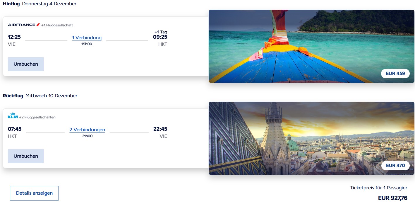 Bei Air France lassen sich im Moment sehr günstige Premium Economy Class Flüge von Wien nach Phuket buchen. Verfügbarkeiten gibt es ohne veröffentlichte Beschränkungen bei Abflug im Dezember und im Juni 2026. Die Langstreckenflüge bucht die Airline in der Buchungsklasse A ein. Bei diesem Tarif ist Handgepäck inkludiert, aufgegebenes Gepäck muss zusätzlich bezahlt werden.