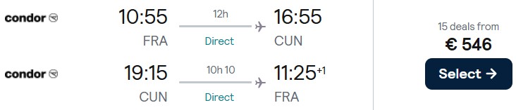 Fliegen Sie nonstop mit Condor von Frankfurt nach Cancun. Verfügbarkeiten gibt es im Dezember 2025 und die Preise starten bei 546 Euro.