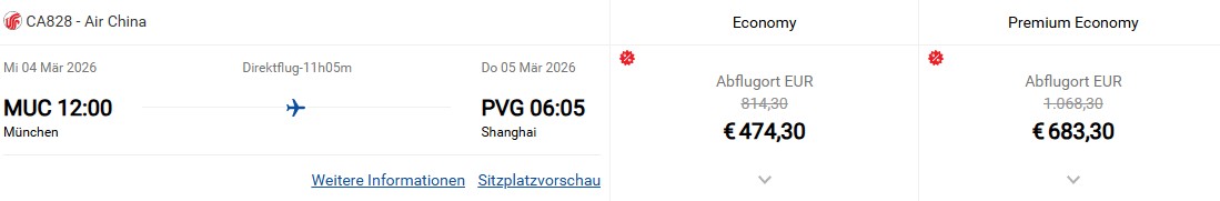 Bis 31. März 2026 können Sie auf ausgewählten Air China Flügen den Komfort der Premium Economy Class zu einem Aufpreis ab 200 Euro pro Strecke genießen. Dieses Angebot gilt auf Flügen von Frankfurt nach Peking, Shanghai oder Chengdu und von München nach Shanghai oder Chengdu.