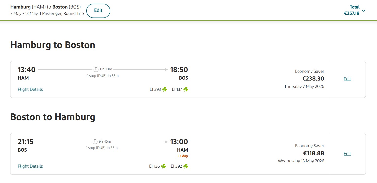 Fliegen Sie mit Aer Lingus in der Economy Class von Deutschland nach Boston ab 357 Euro. Verfügbarkeiten gibt es im Mai und Juni 2026.