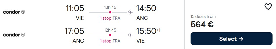 Fliegen Sie mit Condor in der Economy Class schon ab 564 Euro von Frankfurt, München, Berlin, Zürich oder Wien nach Anchorage. Verfügbarkeiten gibt es im Mai und Juni 2026.