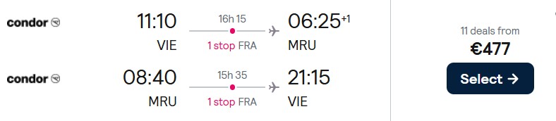 Fliegen Sie im Januar 2026 mit Condor von Wien nach Mauritius ab 477 Euro. Das Preisbeispiel haben wir vom 14. Januar bis zum 26. Januar 2026 gefunden.