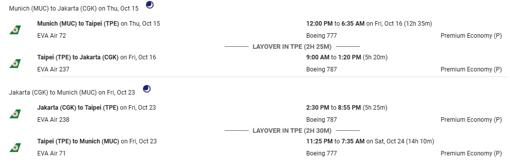EVA Air verkauft bis auf Widerruf relativ günstige Premium Economy Class Flüge von München zu Zielen in Asien. Die Reisezeit ist offen, tarifliche Einschränkungen gibt es keine. Die Premium Economy Class Flüge buchen in der Buchungsklasse P ein und genannte Preise wurden bei Probebuchungen im Oktober 2026 gefunden.