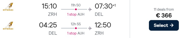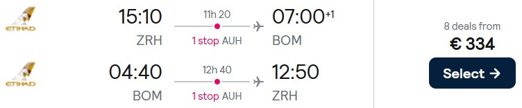 Etihad Airways verkauft günstige Economy Class Flüge von Zürich nach Mumbai und Delhi. Flüge sind von November bis Dezember 2025 möglich und die Preise starten schon bei 338 Euro.