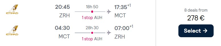 Bis zum 25. April verkauft Etihad Airways günstige Economy Class Tickets von Zürich nach Maskat. Verfügbar ist das Angebot von Mai 2025 bis Januar 2026 und die Preise starten bei 278 Euro.