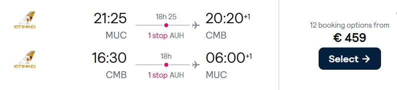 Fliegen Sie mit Etihad Airways in der Economy Class von Düsseldorf, Frankfurt und München nach Colombo ab 459 Euro. Verfügbar ist das Angebot von Januar bis Juni 2026.