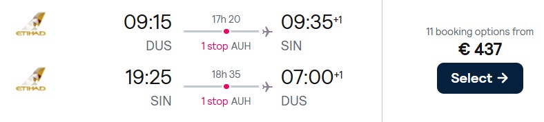 Fliegen Sie mit Etihad Airways in der Economy Class von Düsseldorf nach Singapur ab 437 Euro. Gute Verfügbarkeiten gibt es im Januar und Februar 2026.