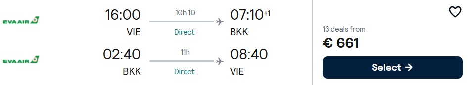 EVA Air verkauft bis auf Widerruf ermäßigte Economy Class Flüge von Wien nach Bangkok. Reisen sind möglich im Mai und Juni sowie von September bis Oktober 2026. Die Preise starten bei 661 Euro. Aufgabegepäck ist inkludiert.