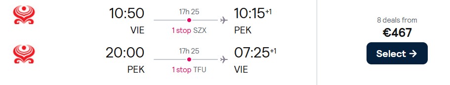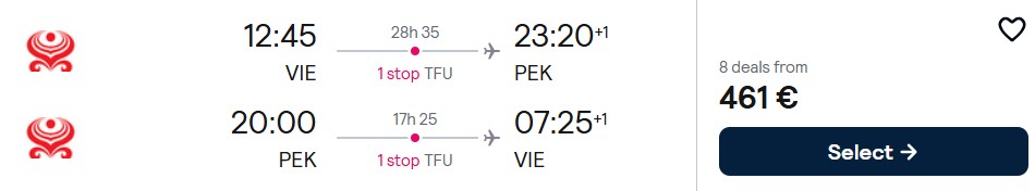 Fliegen Sie mit Hainan Airlines in der Economy Class von Wien nach Peking ab 467 Euro. Verfügbarkeiten gibt es von Mitte Mai bis Mitte Juni 2026.