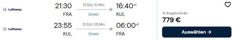 Lufthansa fliegt ab Anfang November 2026 neu nonstop von Frankfurt nach Kuala Lumpur und aktuell sind die Preise in der Economy Class durchaus attraktiv. Verfügbarkeiten finden sich bei Abflug zwischen dem 1. November und dem 6. Dezember 2026 und als Einschränkung gilt ein Mindestaufenthalt von 6 Tagen. Der im Text genannte Preis wurde vom 01. November bis zum 08. November 2026 gefunden.