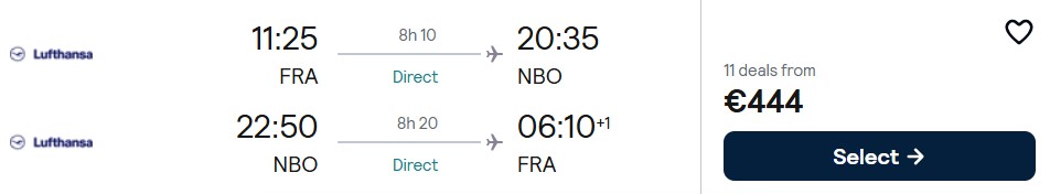 Fliegen Sie mit Lufthansa nonstop von Frankfurt nach Nairobi in der Economy Class bereits ab 444 Euro. Verfügbarkeiten gibt es im Mai 2026, das Preisbeispiel wurde vom 15. Mai bis zum 27. Mai 2026 gefunden.