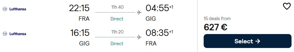 Fliegen Sie mit Lufthansa nonstop in der Economy Class von Frankfurt nach Rio de Janeiro ab 627 Euro. Verfügbarkeiten gibt es im Mai und Juni 2026.