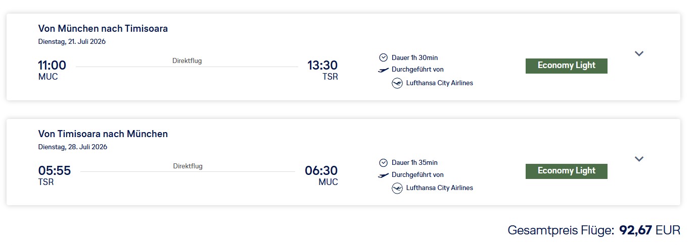 Fliegen Sie mit Lufthansa von München nach Timisoara, Cluj-Napoca, Sibiu und Bukarest in Rumänien ab 92 Euro. Verfügbarkeiten gibt es bis Januar 2027. Es gilt ein Mindestaufenthalt von 3 Tagen oder einer Nacht auf Samstag oder Sonntag.