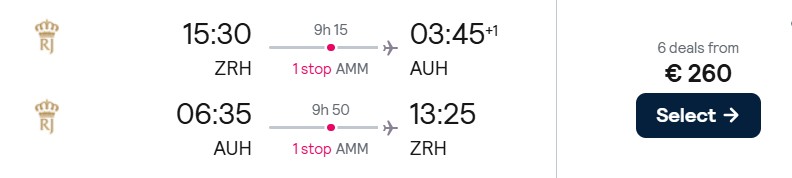 Royal Jordanian verkauft bis auf Widerruf günstige Economy Class Flüge von Zürich nach Abu Dhabi und Dubai. Verfügbarkeiten gibt es von Januar bis März 2026, die Preise starten bei 260 Euro.