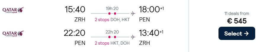 Fliegen Sie mit Qatar Airways in der Economy Class von Zürich nach Kuala Lumpur und Penang ab 545 Euro. Verfügbarkeiten gibt es von Februar bis Juni sowie von September bis November 2026.
