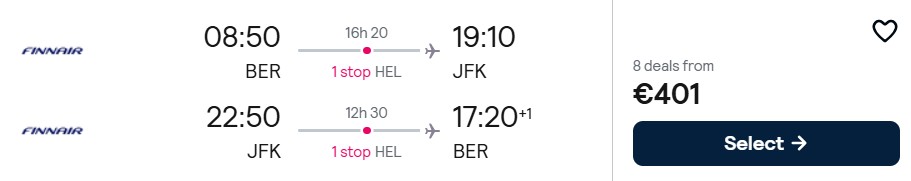 Fliegen Sie mit Finnair von Berlin nach New York ab 401 Euro. Verfügbarkeiten gibt es von August bis Oktober 2026.