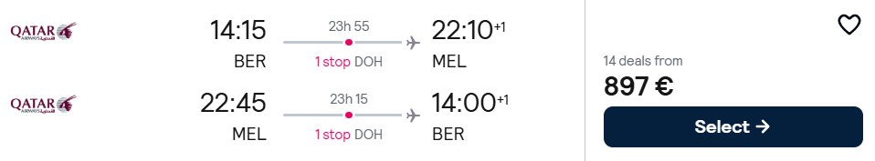 Bis zum 18. Februar verkauft Qatar Airways günstigere Economy Class Tickets von Berlin und Frankfurt nach Melbourne. Verfügbar ist das Angebot zwischen Februar und Dezember 2026, ausgenommen im Juli und Oktober. Es gelten ein Mindestaufenthalt von 4 Tagen und ein Maximalaufenthalt von 2 Monaten. Die Preise starten bei 897 Euro.