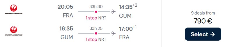 Fliegen Sie mit Japan Airlines von Frankfurt nach Guam in der Economy Class ab 790 Euro. Verfügbarkeiten gibt es bis Juni 2026. Es gilt ein Mindestaufenthalt von 3 Tagen, Aufgabegepäck ist inkludiert.