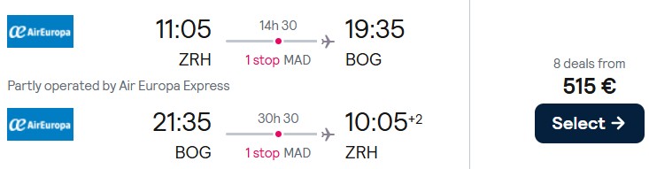 Beim SkyTeam Mitglied Air Europa lassen sich derzeit sehr günstige Economy Class Flüge von Zürich nach Bogota buchen. Verfügbarkeiten gibt es zwischen Januar und März 2026. Die Preise starten bereits bei 515 Euro.