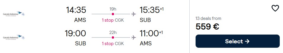 Fliegen Sie mit Garuda Indonesia von Amsterdam nach Bali, Surabaya und Medan ab 559 Euro. Verfügbarkeiten gibt es zwischen September 2026 und Februar 2027. Es gilt ein Mindestaufenthalt von 7 Tagen sowie ein Maximalaufenthalt von 1 Monat.