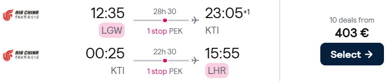 Mit Air China können Sie aktuell ab 403 Euro von London nach Phnom Penh in Kambodscha reisen. Diese Tickets sind bis auf Weiteres verfügbar mit Abflug zwischen Oktober und Dezember 2025.