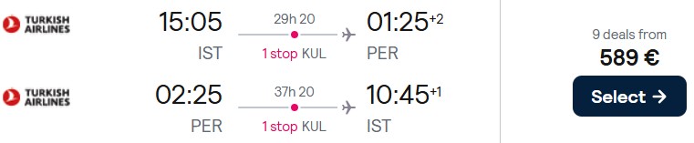 Fliegen Sie mit Turkish Airlines ab 589 Euro von Istanbul nach Perth. Verfügbarkeiten gibt es im Februar und März 2026.