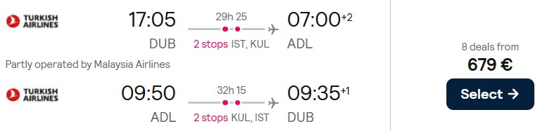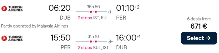 Fliegen Sie mit Turkish Airlines in der Economy Class ab 671 Euro von Dublin nach Adelaide oder Perth in Australien. Verfügbarkeiten gibt es von Februar bis Juni sowie im August und September 2026.