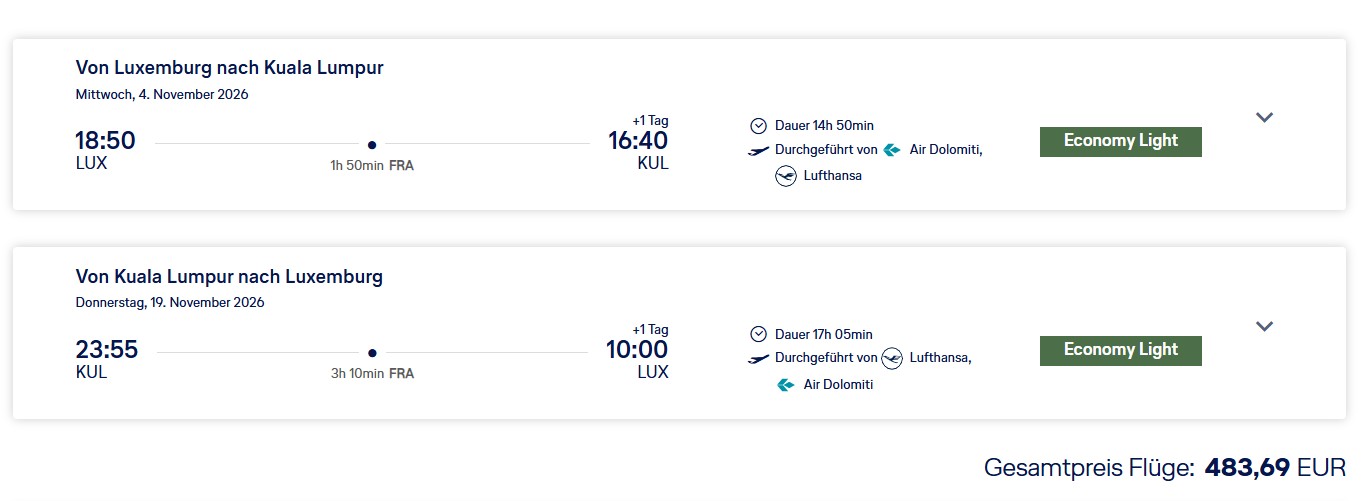 Fliegen Sie mit Lufthansa in der Economy Class ab 484 Euro von Luxemburg nach Kuala Lumpur. Verfügbarkeiten gibt es von Ende Oktober 2026 bis Januar 2027.