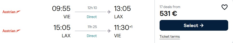 Fliegen Sie mit Austrian Airlines nonstop in der Economy Class von Wien nach Los Angeles ab 531 Euro. Verfügbar ist das Angebot für Reisen von Ende April bis Mitte Juli 2026.