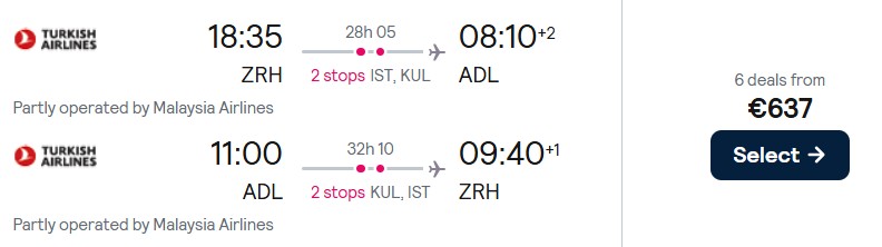 Fliegen Sie mit Turkish Airlines von Zürich nach Adelaide ab 637 Euro. Verfügbarkeiten gibt es von April bis Juni sowie von September bis November 2026.